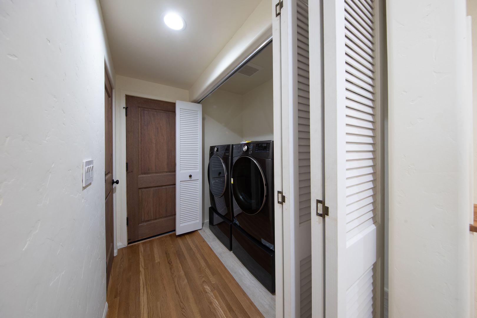 Inside, a large formal entry foyer leads to a bright living room with 9' ceilings, built-ins, sconce lighting, and a decorative fireplace. The dining area connects to a sleek, modern kitchen with stainless steel appliances and abundant storage. A central hallway offers multiple closets, side by side LG laundry, and a convenient powder room.